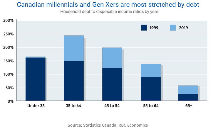 High house prices are the primary reason for elevated debt levels. Roughly, 75 per cent of Canadian household debt comes from mortgages backed by real estate. Intuitively, those at peak house buying age (i.e., first-time buyers and move-up buyers between age 35 and 54) carry far more debt relative to income than other age groups.