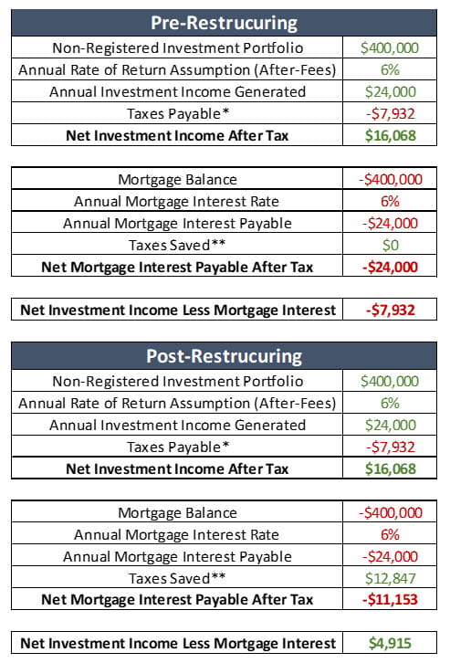 Assuming a six per cent annual after-fee rate of return on investments in a non-registered portfolio, all investment income generated being Canadian dividend income in the non-registered portfolio, and an annual mortgage rate of six per cent, a taxpayer who is at the top marginal tax rate and has $400,000 in mortgage debt would experience an annual net benefit of ~$12,847 by restructuring his or her debt to be tax deductible.