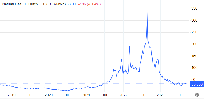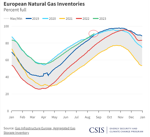 European Gas in Storage a Good Sign for Future EU Inflation. The EU reached its 90 per cent gas storage target roughly two-and-a-half months ahead of its own November 1 deadline. While all four-season nations/continents seasonally build up natural gas reserves from spring to fall and draw those reserves from fall to spring, the EU is much more reliant on its reserves due to little natural gas production of its own. In the fall of 2022, the EU was scrambling to fill its natural gas storage facilities, paying more than 10x the current natural gas price to shore up its natural gas storage as it faced potential supply shortages resulting from the war in Ukraine and worsening relations with its #1 source of natural gas, Russia. Paying so much to fill its natural gas facilities was a major factor in driving EU inflation in late 2022 and early 2023. The winter temperatures experienced in the EU ended up being the mildest in decades, and the continent avoided natural gas shortages and disruptions to industrial activity. But it still had to suffer the inflation caused by the high cost of natural gas purchased to prepare for winter.